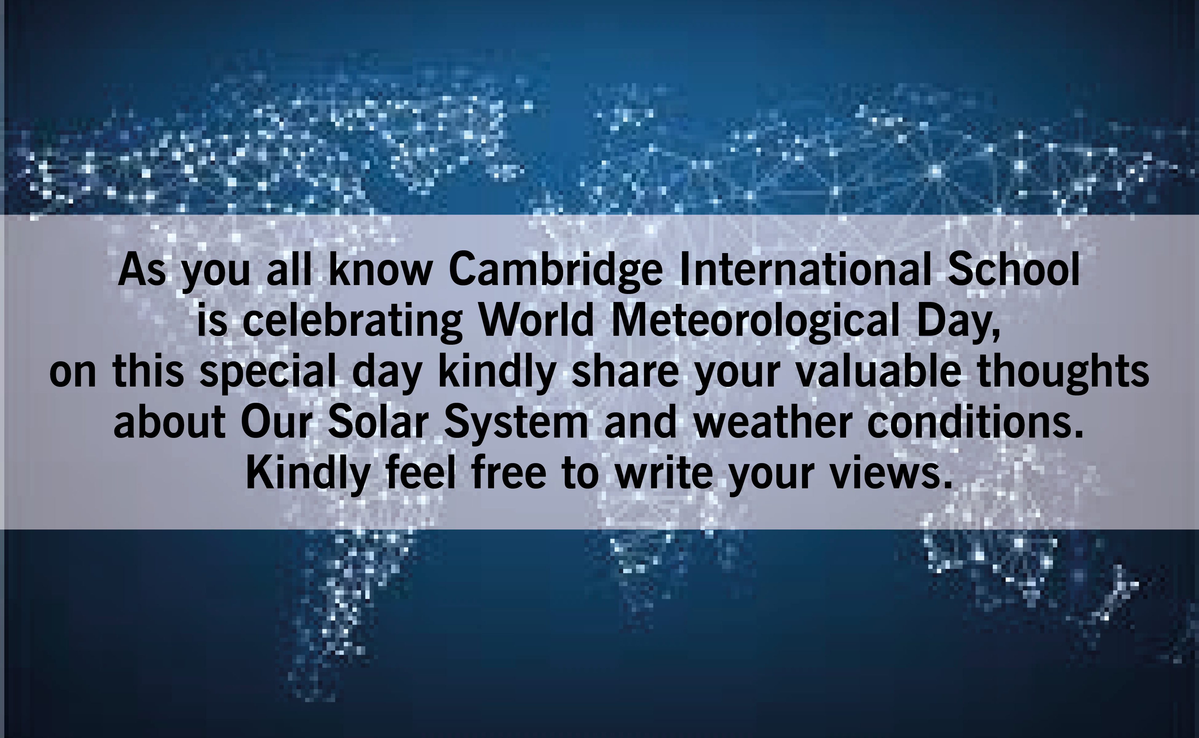 As you all know Cambridge International School is celebrating World Meteorological Day, on this special day kindly share your valuable thoughts about Our Solar System and weather conditions. Kindly feel free to write your views.