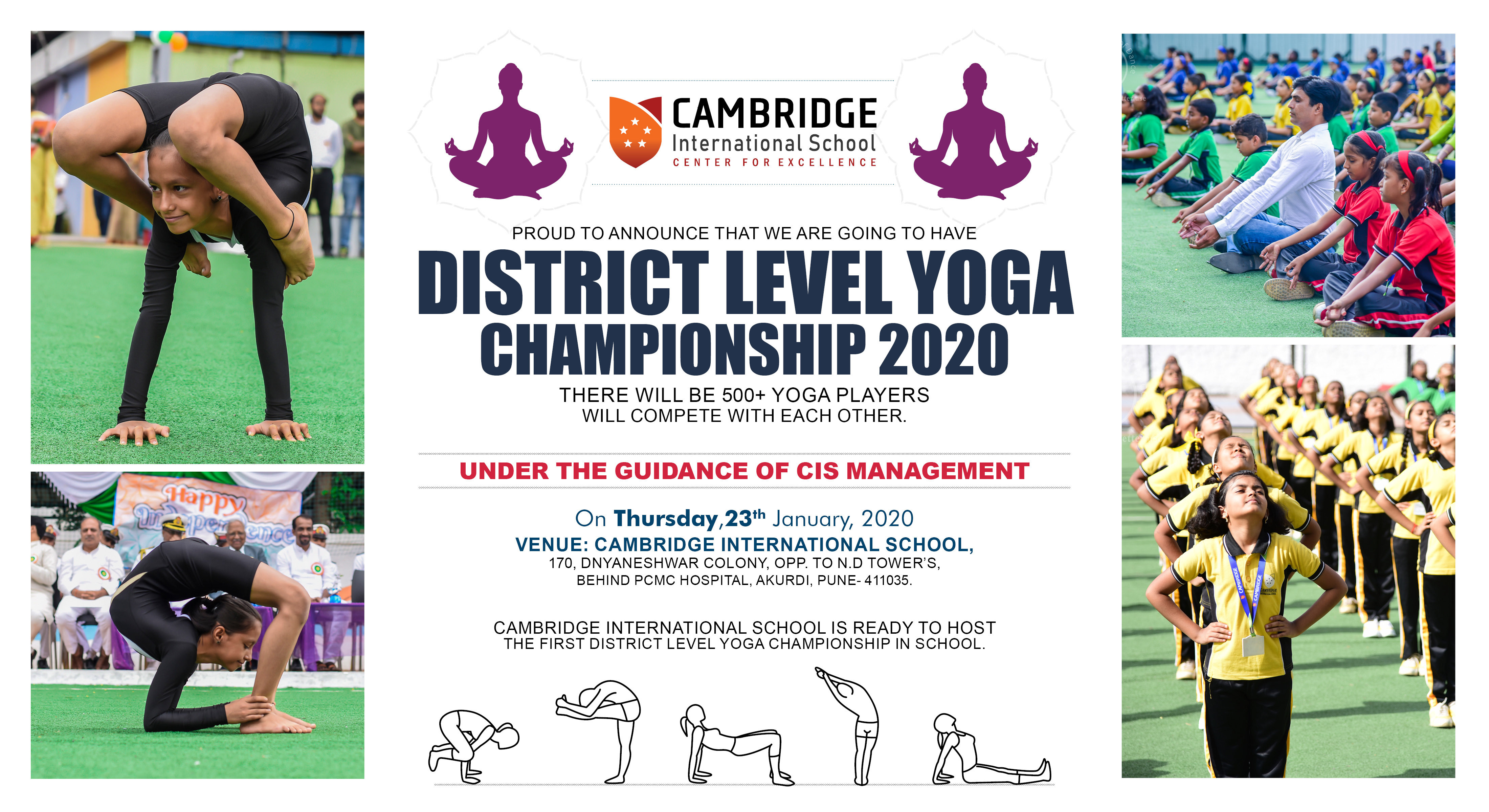 Cambridge International School, proud to announce that we are going to have First District level sports Yoga competition 0n 23 January 2020 at our Cambridge international school yoga center. There will be 500+ yoga players will compete with each other. Under the guidance of Mr. Ram D Raina Cambridge international School is ready to host first district level yoga championship in school.